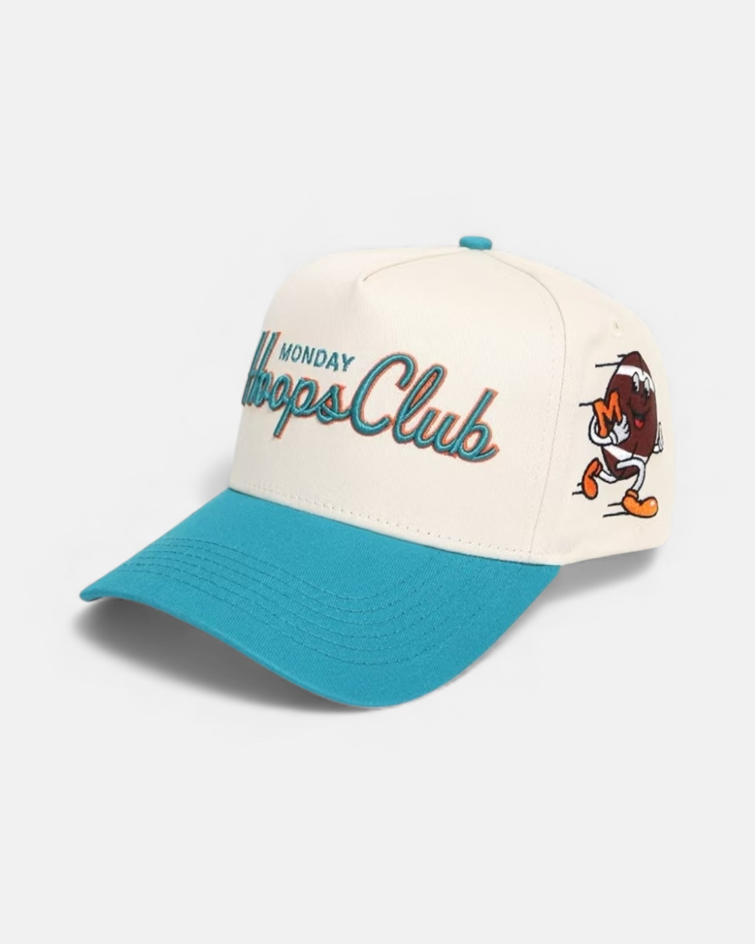 The Sideline collection channels the electric atmosphere of 90's football culture. The Heatwave edition features our Monday Hoops Club script in vibrant aqua and orange – a bold colourway that captures the intensity of championship Sunday.