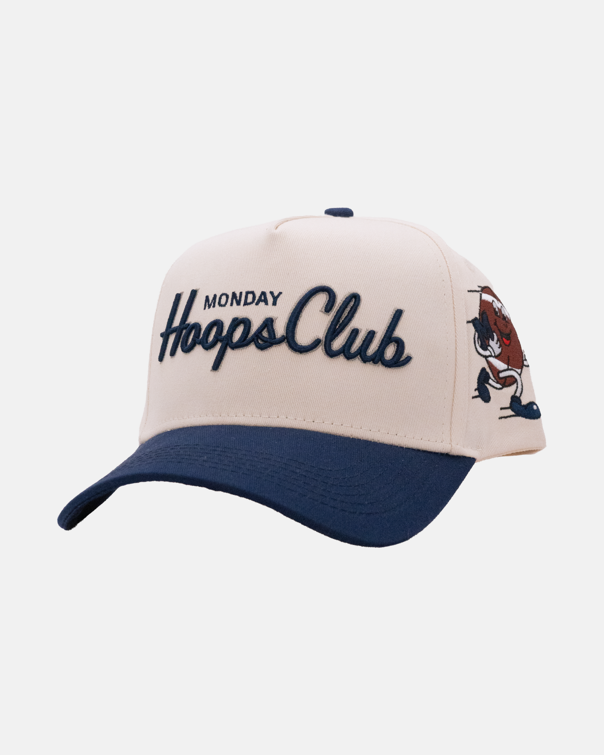 5 panel trucker hat with a cream crown, navy brim & silver/navy embroidery. Snapback closure. Custom Mr. Monday football graphic on the left side of crown.