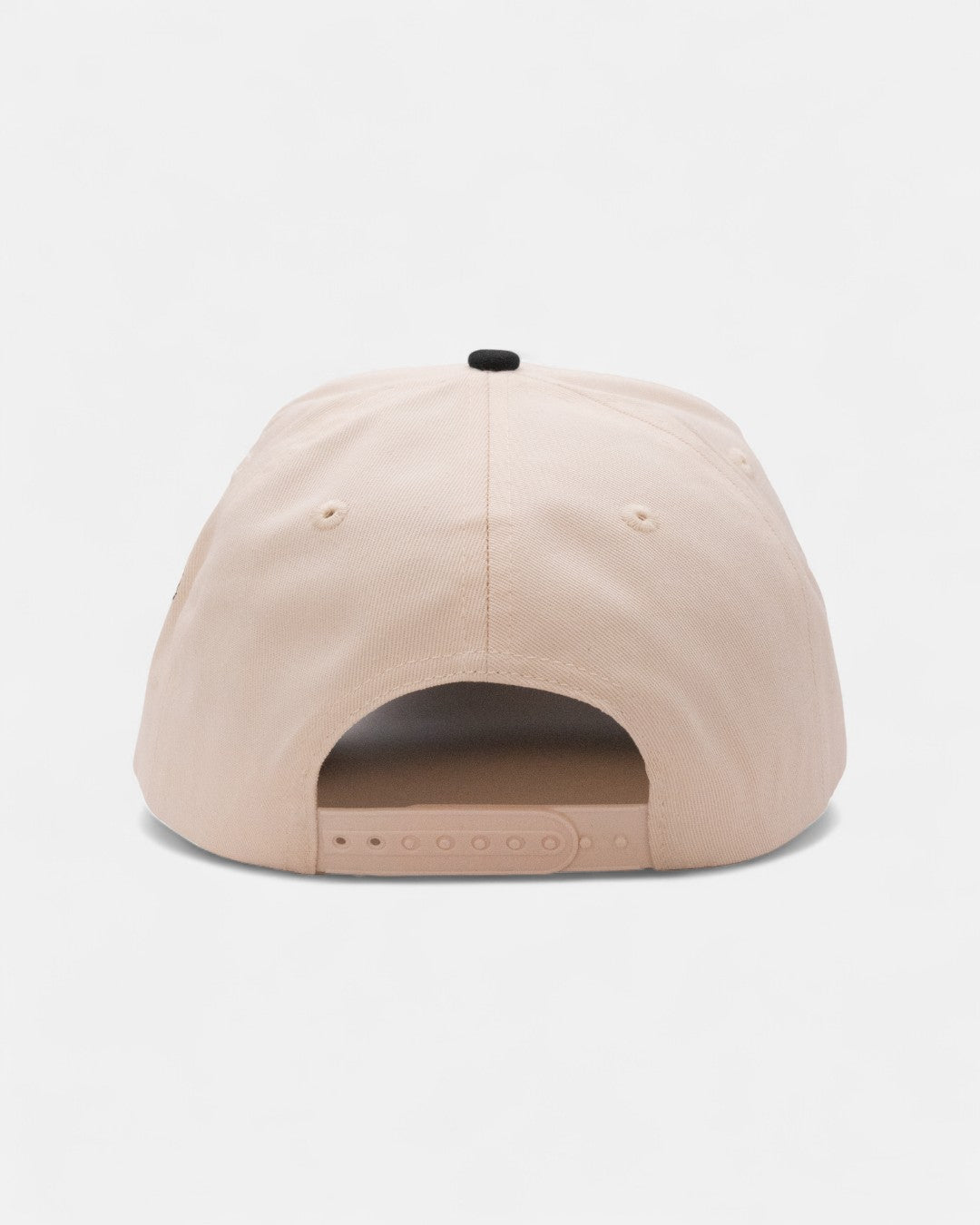 5 panel trucker hat with cream crown, black brim, and black & orange embroidery with a snapback closure. Custom Mr. Monday Plays Ball graphic on the left side of crown.