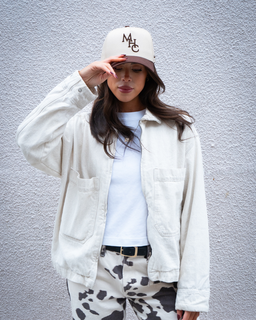 5 panel trucker hat with a cream crown, espresso brown brim & embroidery, with a snapback closure. Our custom MHC logo on the front with a new Monday x Jade graphic on the left side of crown.